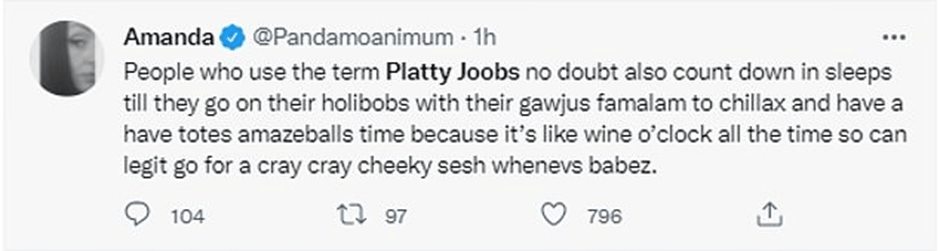‘Platty Joobs’ (for Platinum Jubilee in case you missed it) and ‘famalam’ have a Professor Stanley Unwin feel, for me and possibly others of my advanced years. Unwin was an eccentric old chap who used to perform monologues on the radio in the 1950s in which he mangled words and phrases and challenged listeners to interpret what he was saying. ‘Unwinese’ added nonsense syllables, reversed syllables, jumbled parts of sentences – like children’s nonsense stories and nursery and baby talk does. Exaltation of childhood by way of whimsy and nonsense (as in the works of Lewis Carroll, Edward Lear) has been an enduring feature of British literary and popular culture – perhaps a tactic by which we try to play down the dark side of life, smooth over social inequalities and make light of the blunders of our ruling class: deploying non-stop facetiousness, irony, cheek and irreverence in all everyday communications.